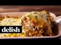 - Spoon browned meat right into a 9x13 inch glass baking dish. Spoon a layer of refried beans over meat, then salsa. Top with shredded cheese.